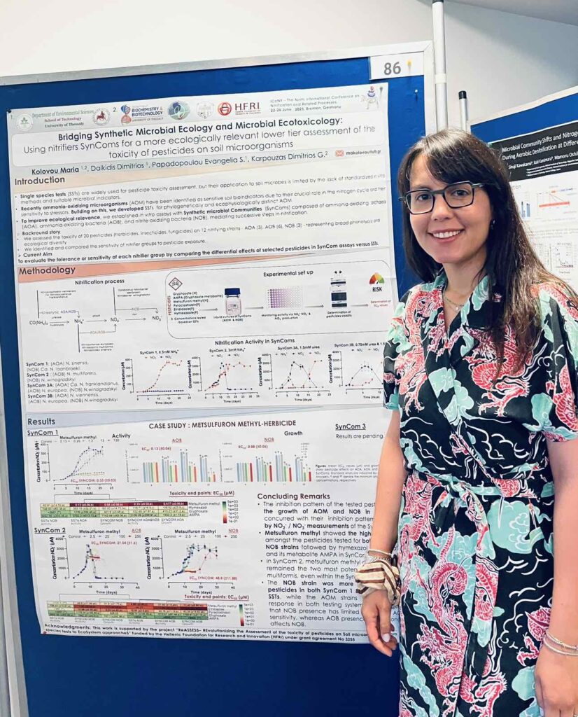 - Maria Kolovou (University of Thessaly) presented both an oral communication at the Early Career Researcher Workshop and a poster at the main conference, focusing on the use of synthetic microbial communities (SynComs) as model systems for assessing the ecotoxicity of pesticides on ammonia-oxidizing microorganisms. This approach aims to simulate microbial interactions more realistically than conventional single species tests.